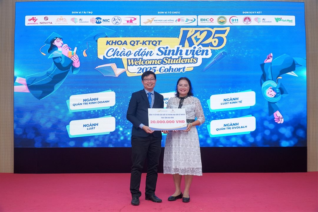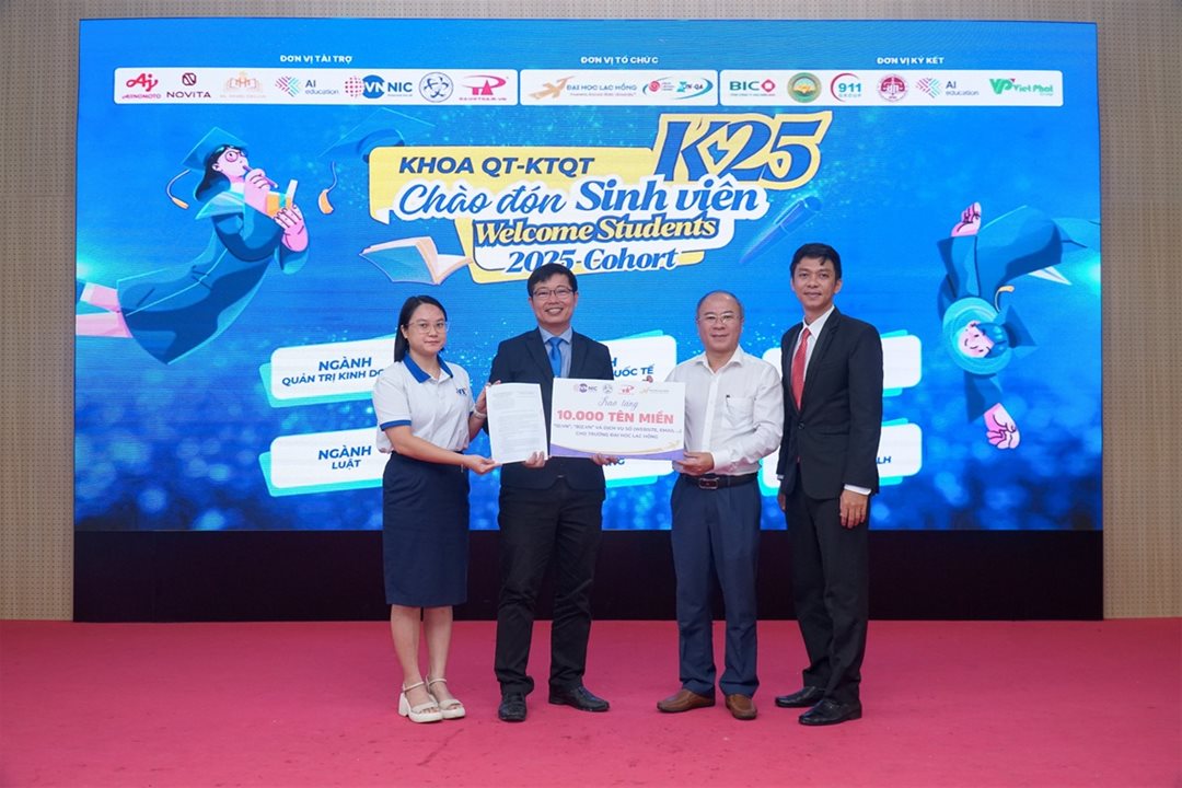 • Hỗ trợ công nghệ cho kỷ nguyên số: Đại diện Sở KH&CN tỉnh Đồng Nai, Trung tâm Internet Việt Nam (VNNIC) và Công ty TNHH P.A Việt Nam đã dành tặng 10.000 tên miền "id.vn", "biz.vn" cùng các dịch vụ số đi kèm (Website, Email,...). Phát biểu tại sự kiện, ông Nguyễn Minh Quang – Phó Giám đốc Sở KH&CN tỉnh Đồng Nai đã nhấn mạnh tầm quan trọng của việc xây dựng thương hiệu cá nhân và năng lực số cho sinh viên trong bối cảnh hiện nay. Ông cũng bày tỏ hy vọng rằng món quà 10.000 tên miền sẽ là công cụ hữu ích, tiếp sức cho các bạn tân sinh viên Khoa QT-KTQT trên hành trình học tập, sáng tạo và khởi nghiệp tương lai.