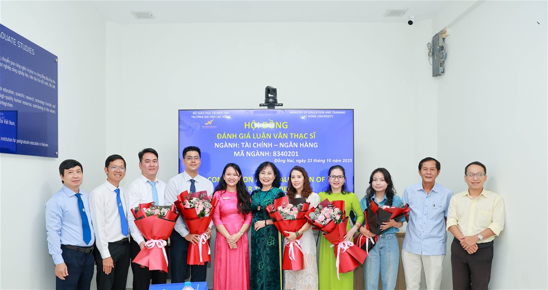 Ngày 23 tháng 10 năm 2025, tại phòng B107 (Phòng tiến sĩ) cơ sở 1 của Trường Đại học Lạc Hồng (LHU), Hội đồng đánh giá luận văn thạc sĩ chuyên ngành Tài chính - Ngân hàng đã tổ chức buổi bảo vệ luận văn cho 05 học viên. Buổi lễ diễn ra trong không khí trang trọng và đầy tính học thuật, với sự tham gia của các nhà khoa học, giảng viên uy tín và các chuyên gia đầu ngành.