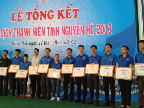 The same day's afternoon, at 14:00 p.m, LHU voluntary youth members together with 800 young people of other units gathered at Dong Nai University to attend the closing ceremony of 2013 Green Summer Campaign. At the closing ceremony, Dong Nai provincial Youth Union Standing Committee presented certificates of merit to LHU collective and two individuals including team leader Huynh Thuc Hieu and deputy leader Nguyen Ca Thuan.