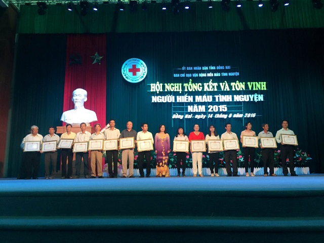 At the ceremony, Dong Nai provincial Mobilization Board for Voluntary Blood Donation made a summary report on 2015 blood donation campaign and praised outstanding individuals and organizations for their performance in voluntary blood donation movement. On the occasion, the Red Cross Association of Vietnam awarded eight Bronze Plates and certificates of merit to 15 collectives and 23 individuals for their outstanding achievements in voluntary blood donation campaign. Also, Dong Nai provincial People's Committee presented certificates of merit to 42 families and 55 individuals for their great contributions to blood donation; certificates of merit to 20 collectives and 25 individuals for their excellent achievements in 2015 blood donation mobilization.